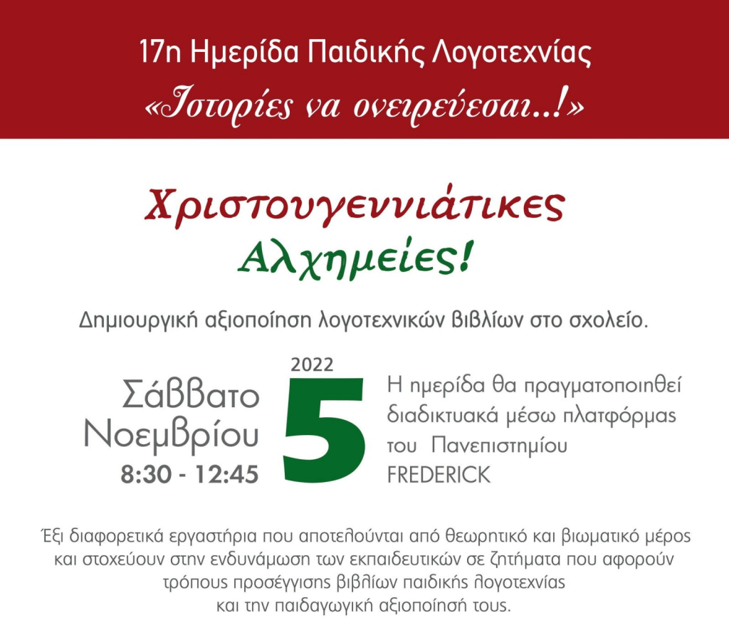 Στις 5/11/2022 θα συμμετέχω με ένα βιωματικό εργαστήριο στη 17η Ημερίδα Παιδικής Λογοτεχνίας «Ιστορίας να ονειρεύεσαι».